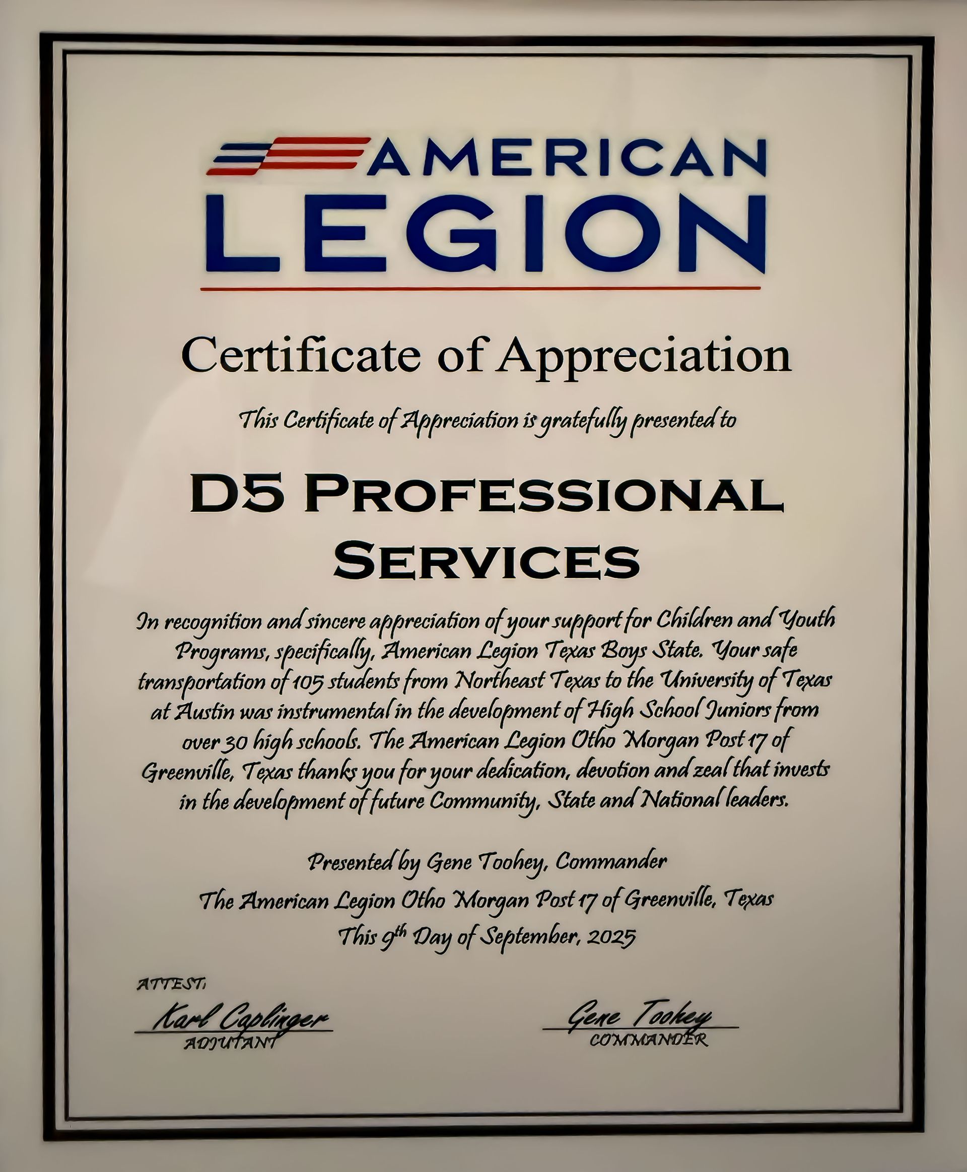 In 2025, D5 Professional Services was honored by the American Legion for our commitment to safe and dependable youth transportation, serving over 100 students traveling to the University of Texas at Austin for the Texas Boys State program. This award reflects our ongoing dedication to service that extends beyond our clients and into the community.